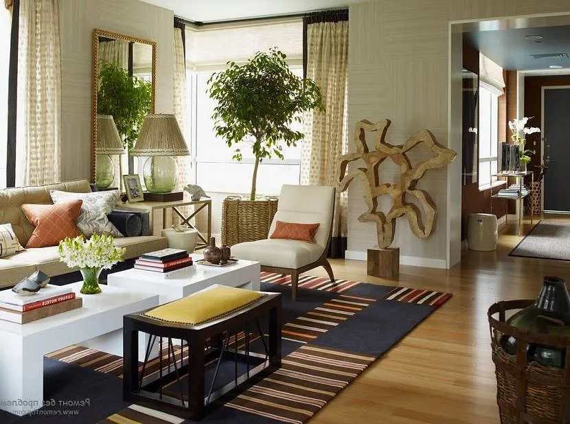 Если размеры гостиной позволяют, поставьте диван простой формы посередине, чтобы со всех сторон к нему было удобно подойти. На полу расположите небольшой шерстяной коврик и поставьте журнальный столик со стеклянной столешницей и деревянными ногами. Одну из стен украсьте деревянными спилами. Не загромождайте пространство мебельной стенкой, если на самом деле она вам не особо нужна. На полу в свободных углах поставьте высокие комнатные растения. Горшки лучше использовать деревянные или керамические в одном стиле. Новомодную технику не стоит выставлять напоказ и делать ее центром внимания как в интерьерах в стиле хай-тек. В данном случае нужно постараться скрыть ее в специально предусмотренные ниши или раздвижные системы.