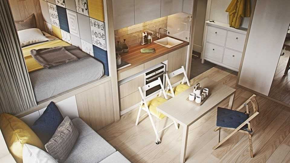 Кухню можно так же разместить на подиуме, это отделит её от зала. Интерьер небольших квартир может быть различным, в соответствии со взглядами заказчика