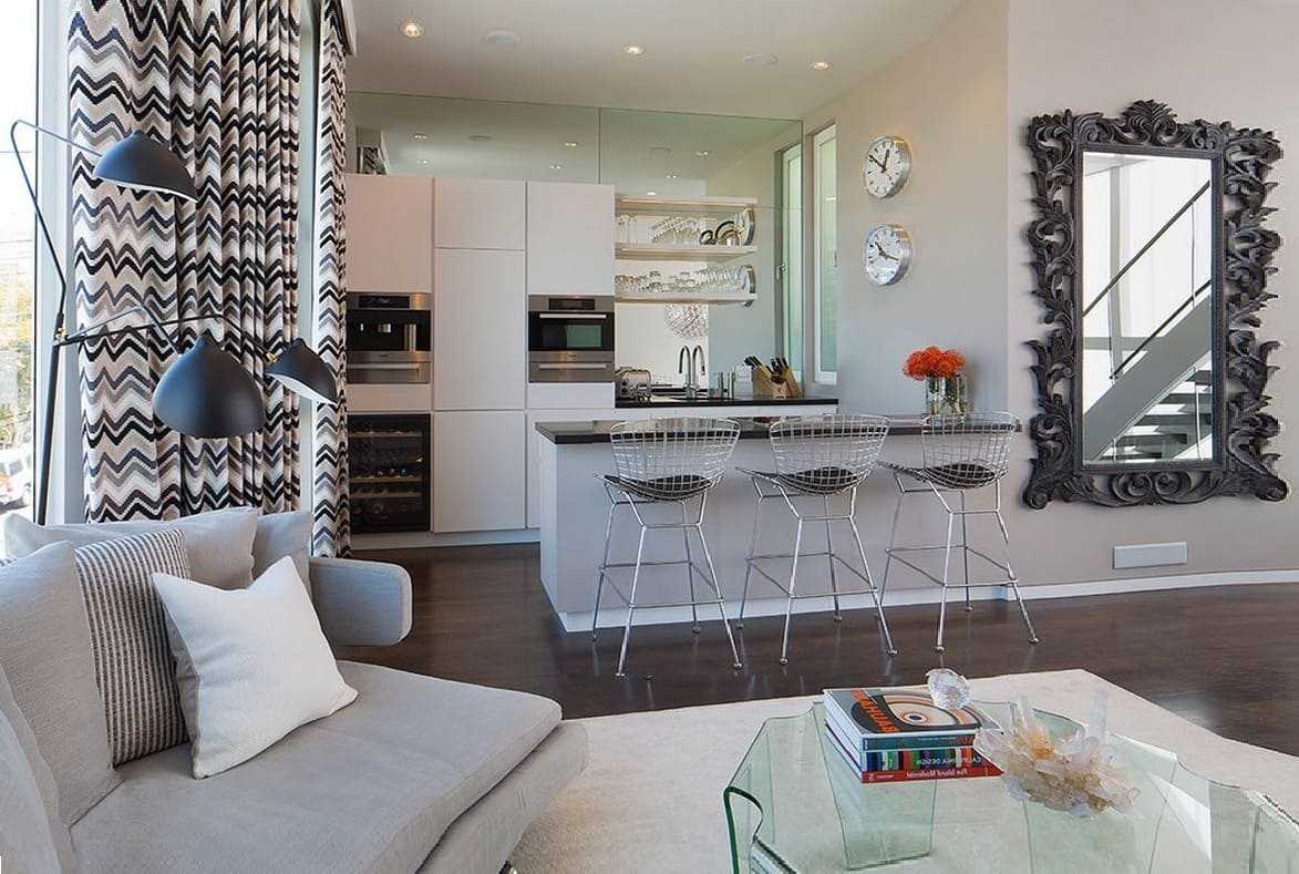 На фото дизайн квартиры-студии 50 квадратов, выполненный в современной стилистике.