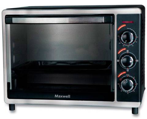 Корпус получил двухцветную окраску. Управление – электронное: кнопки расположились на передней части корпуса, там же виднеется небольшой экран. Объем камеры – 28 литров, мощность 1500 Вт. Здесь обширная комплектация: противень, решетка, держатель противня, а также вертел.