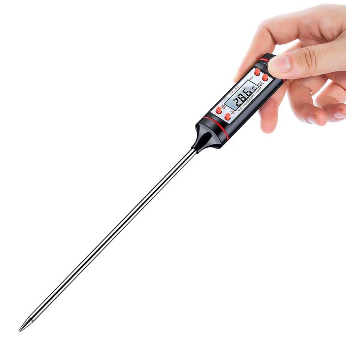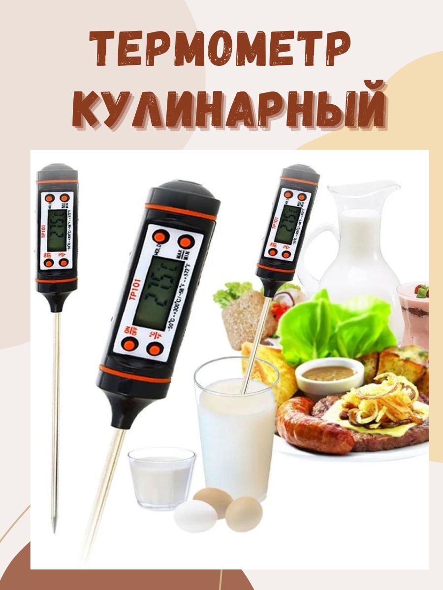 Электронный щуп с жк-дисплеем используется для измерения температурных данных как жидкостей, так и продуктов питания, в том числе с его помощью можно установить температуру готового мяса. Сам щуп изготовлен из нержавеющей стали, корпус же пластмассовый. Имеется индикатор заряда батареи, что позволяет точно отслеживать работоспособность прибора. Максимально возможные показатели для измерения — 300 градусов по Цельсию. После 40-ка минут бездействия устройство само отключается. Длина щупа средняя и составляет 10,5 см.