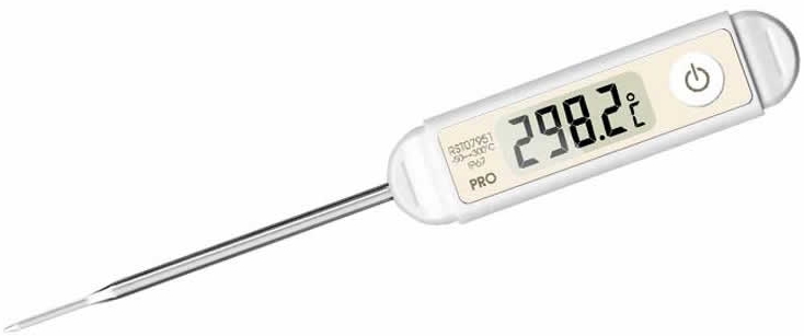 Прибор позиционируется как универсальный, то есть его можно использовать для проведения измерений любых жидких, сыпучих и твердых продуктов путем простого погружения щупа в саму среду. Диапазон измерений – до 300 градусов, при этом есть возможность переключать электронное табло или на градусы по Цельсию, или по Фаренгейту. Устройство оборудовано памятью для фиксации данных последних измерений, для питания необходима всего одна небольшая батарейка. Благодаря длинному щупу-игле (15 см) можно без особых сложностей приникать в самую середину куска мяса для наиболее точных замеров температуры.