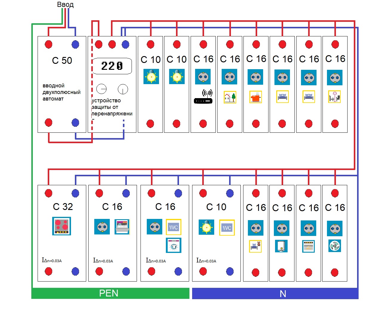 Вводной автомат двухполюсный. Использование общего автомата в распределительном щите необходимо для полного обесточивания всего дома. В случае аварии двухполюсный автомат отключит полностью всю линию. Возможно использование однополюсного автомата: в этом случае ноль заводится напрямую на шину «N».
