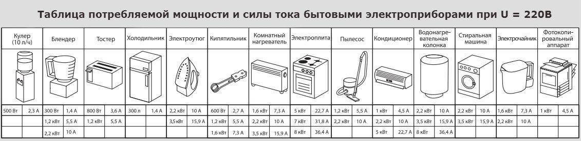 Таблица потребляемой мощности и силы тока бытовых электроприборов при напряжении питания 220В