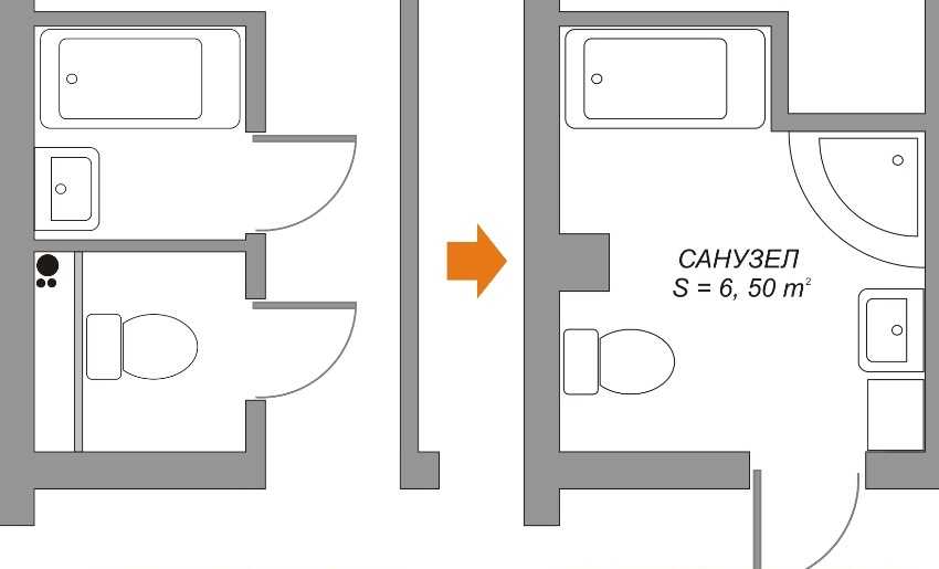 Пример объединения туалета и ванной комнаты — сложна перепланировка, когда требуется перенос трубы