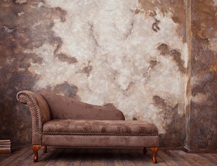 Для создания покрытия используют шпатель, добавляя на него составы сразу нескольких цветов. Смесь накладывают на стену зигзагообразными движениями, обрабатывая таким образом всю площадь. Излишки раствора снимают тем же шпателем, дают покрытию подсохнуть, а затем начинают “железнить” — затирают при помощи строительной кельмы. После обработки на поверхности проступает характерная фактура натурального камня с полуматовым блеском. Для усиления эффекта стену можно покрыть перламутровой эмалью или натуральным воском.