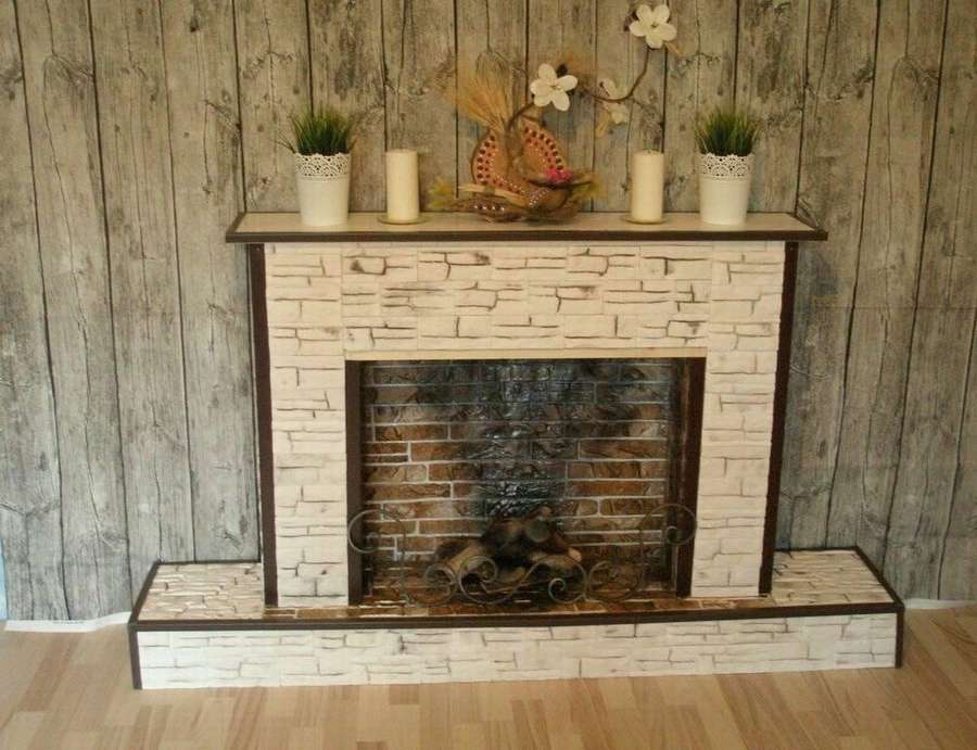 А вот и еще одна идея декора самодельного камина с использованием декоративных «кирпичей».