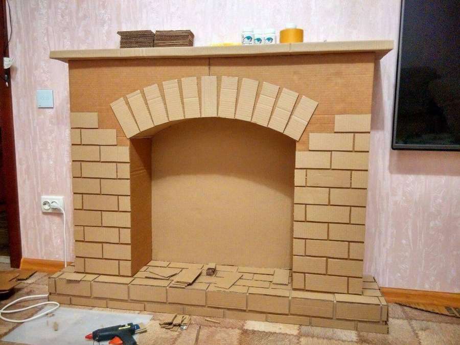 Из картонных коробок сделан декоративный фальш-камин, представленный ниже. Интересна форма. Нестандартное решение – два отверстия-отсека в камине под дрова и под свечи.