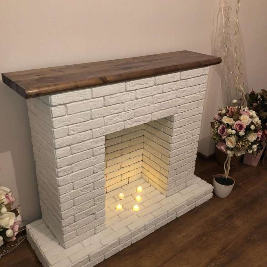 Чисто белый декоративный фальш-камин – рискованный, но действительно впечатляющий вариант для любителей пастельных тонов в интерьере. Перед покрытием краской обязательно обработайте поверхность поделки с помощью наждачки.