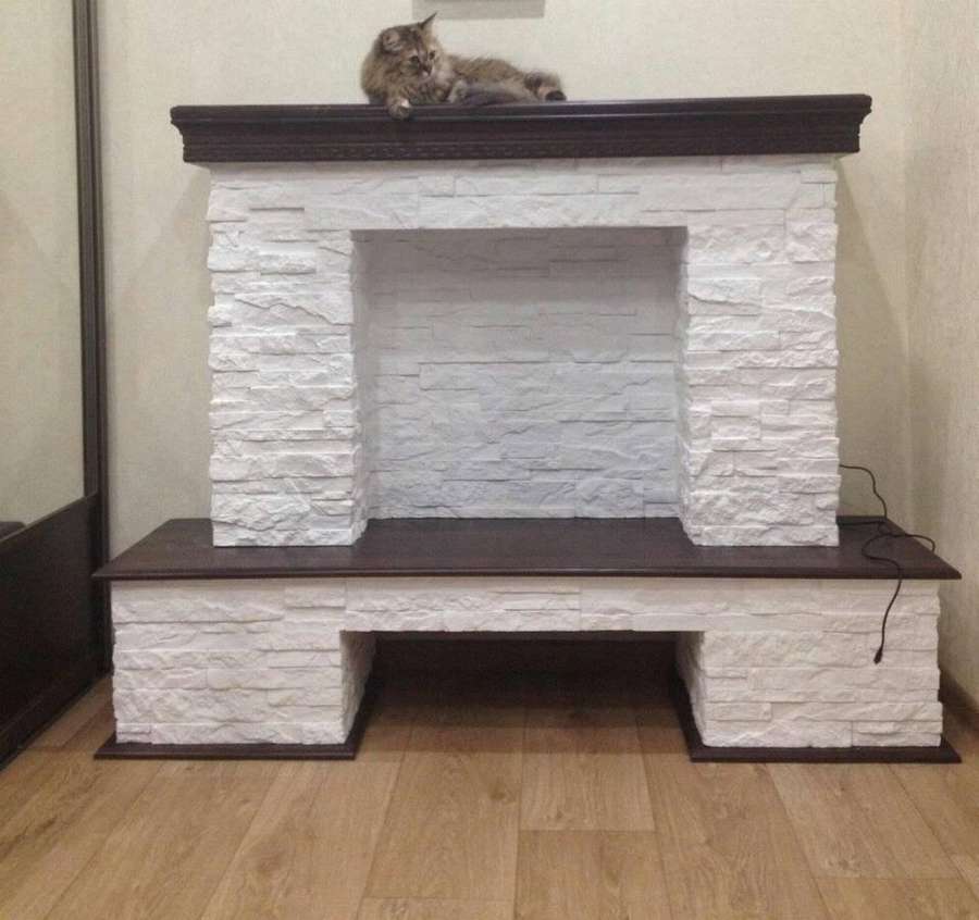 Один из лучших вариантов отделки возведенного фальш-камина своими руками – обкладка декоративным искусственным камнем. Наносить его можно на жидкие гвозди или клей, которые рекомендуются производителем. Чтобы между плитами оставались равномерные щели, которые после будут фуговаться, используются пластиковые крестики-вкладыши.