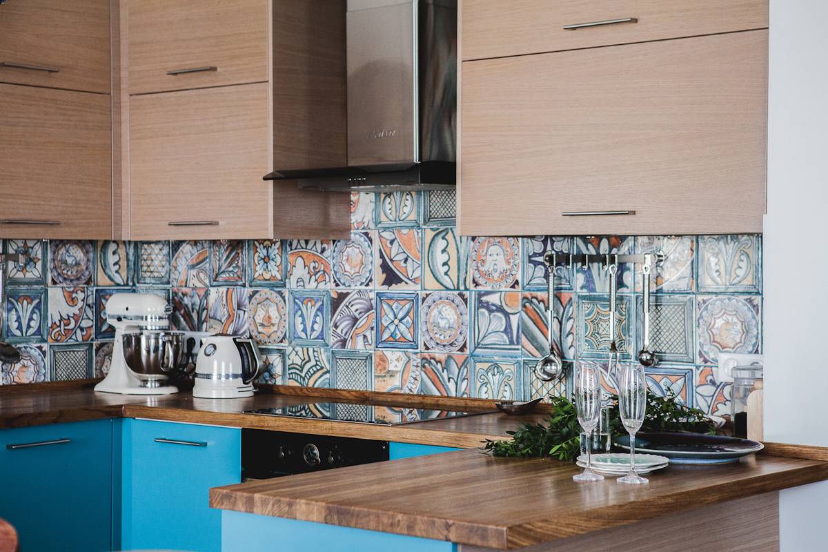 Чем разнообразить однотонный фартук из плитки на кухню: фото-примеры