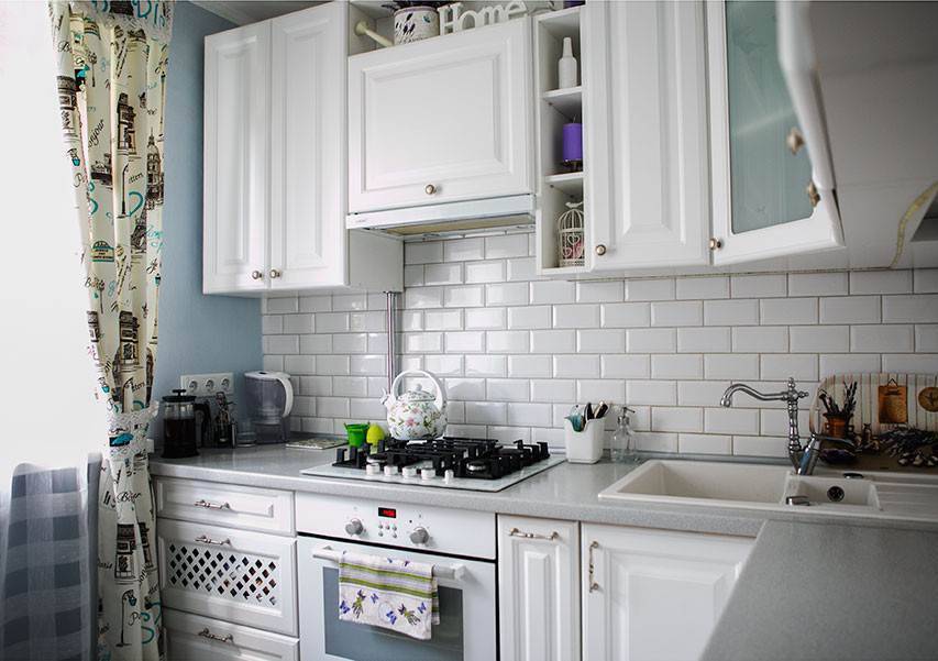 - материалы для белого легче собирать. Фартук для белой кухни следует выбирать в светлых тонах. Это сделает пространство живым и веселым.