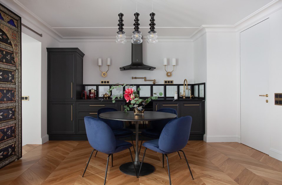 Стены кухни не рекомендуются окрашивать в серый, черный и синий. Последний обладает успокаивающим и расслабляющим эффектом, поэтому он больше подходит для таких комнат, как спальня. Однако, если в подобной расцветки сделать только рабочую зону над плитой, а фасады шкафов выбрать в светлых нейтральных тонах, то может получиться замечательный дизайн интерьера.