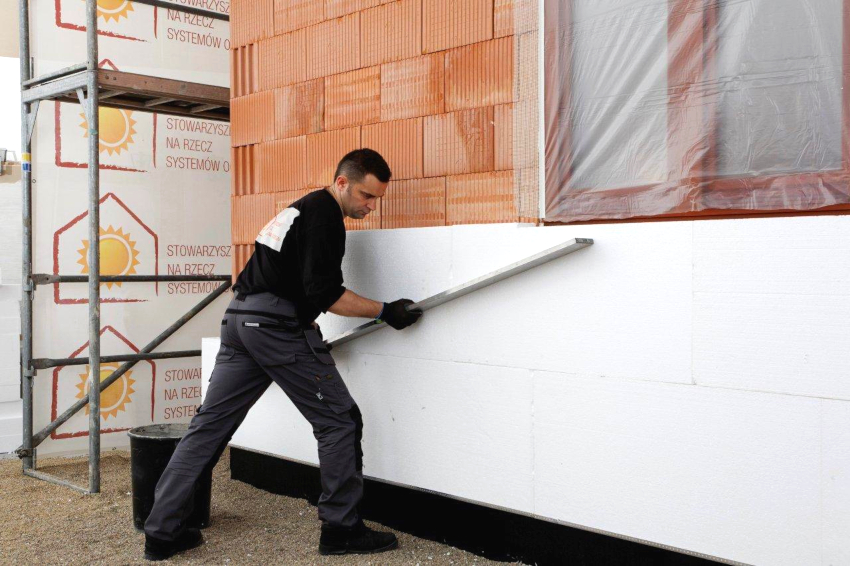 Пенопласт не впитывает влагу, поэтому его можно применять как для утепления фасада, так и для фундамента или цоколя