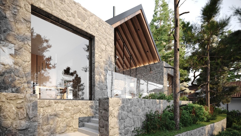Фасад выполнен из натурального дерева, камня и декоративной штукатурки