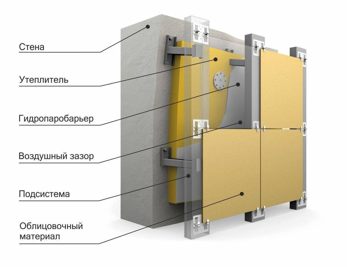 Монтаж плит осуществляется на заранее подготовленную подсистему и сопровождается применением дополнительного фасадного утеплителя. Такую подсистему обустраивают при помощи стальных или алюминиевых профилей.