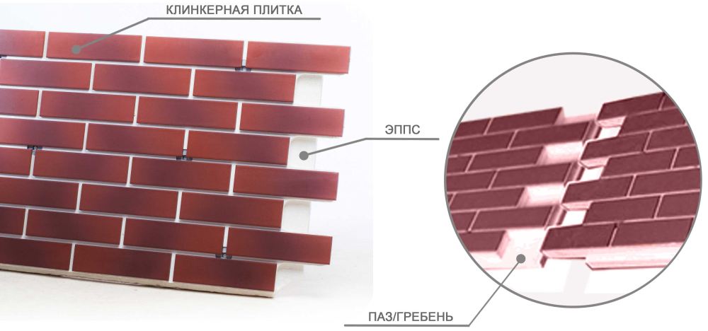 Плитка, имитирующая кирпич, бывает керамическая и клинкерная, соответствующие панели называются клинкерными. Из-за большой площади клинкерные панели монтируются намного быстрее и проще, чем плитка, которую нужно клеить поштучно. Производители декларируют срок службы до 50 лет, но так как материал новый, нет достаточной статистики по сроку службы.