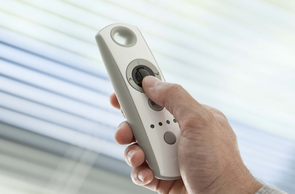 - Беспроводное радиоуправление посредством пульта. В двигатель конструкции устанавливается приемник радиосигнала. После нажатия на кнопку пульта, он срабатывает, приводя в действие механизм жалюзи. Пульт может быть мобильным и перемещаться в другую комнату или крепиться на стене в виде кнопки.