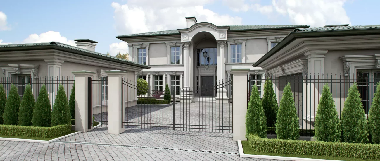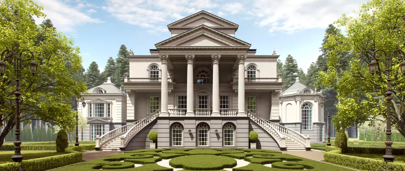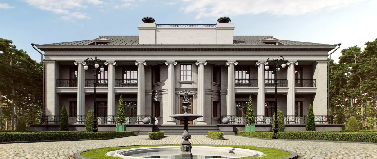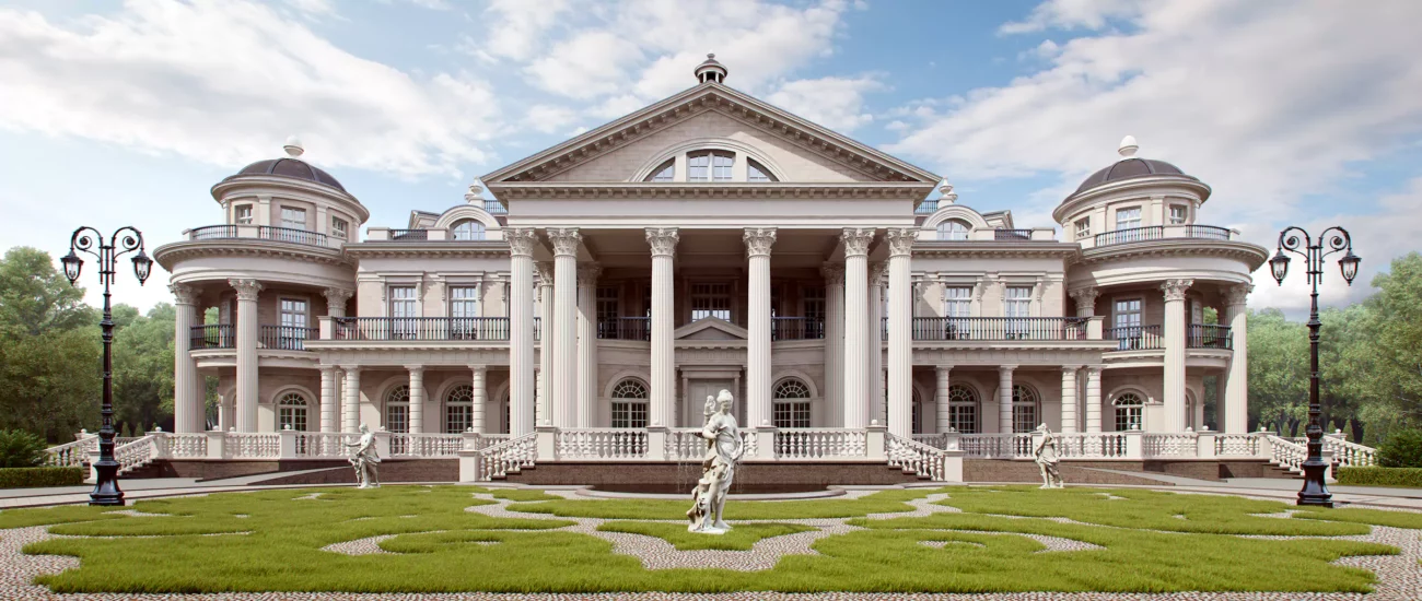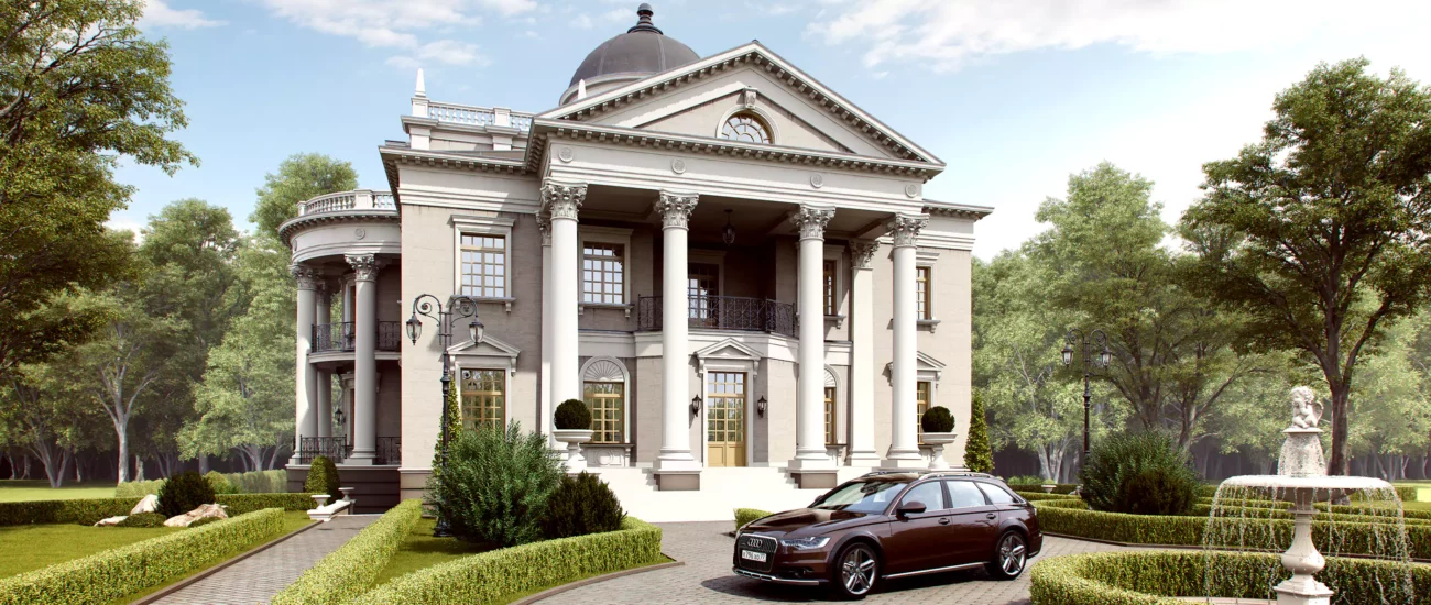 - Экстерьер загородного дома в классическом стиле также включает барельефы, статуи, бортики, лестницы.