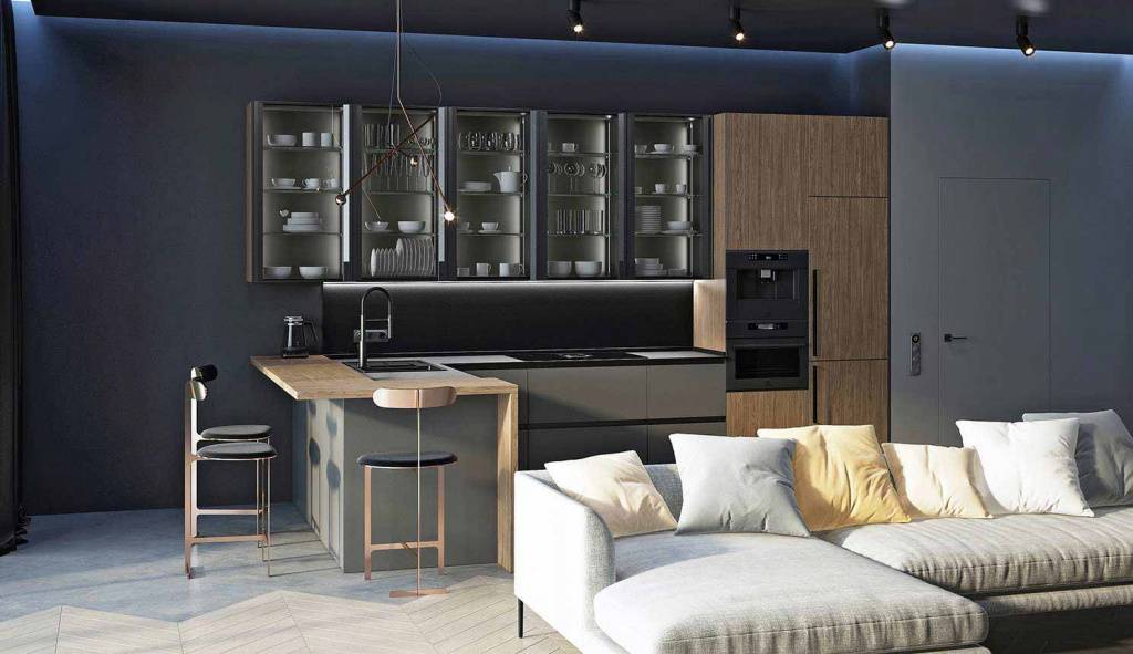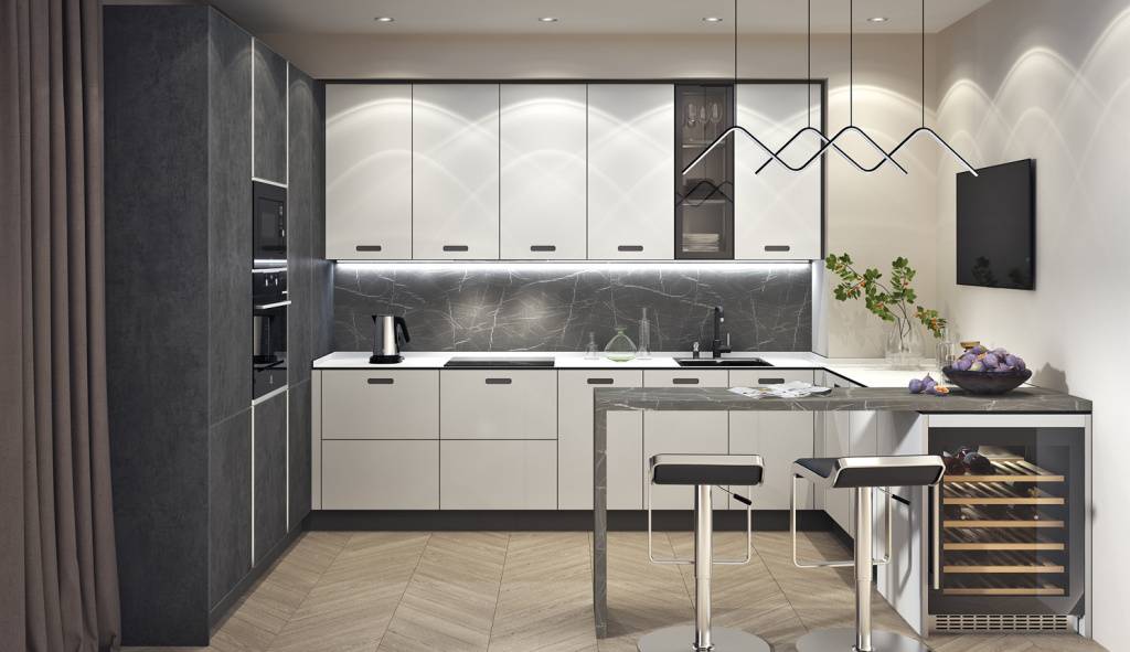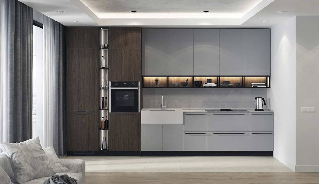 Минималистичный интерьер в серых тонах — это гладкие фасады без ручек, со скрытой системой открывания, без штор, минимум деталей.