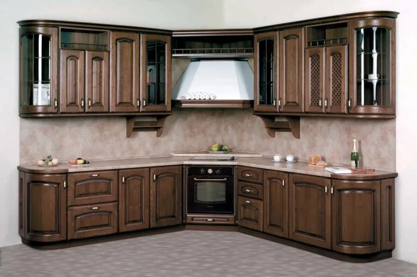 Выглядят респектабельно и красиво. Дорогие гарнитуры выполнены из цельного массива дуба или бука, ореха, черешни, ясеня, других твердых и полутвердых пород дерева. Их окрашивают в различные — чаще всего природные оттенки, покрывают лаком, патиной. Поскольку деревянные фасады ценятся за фактурность и естественный рисунок, их в основном делают цельными, без украшений или декорируют фальш-филенкой, резьбой.