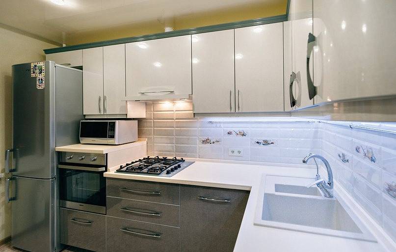 Визуально добавить объем в небольшом кухонном помещении можно за счет двух-, трехцветных фасадов. Часто это более темный низ и светлый контрастный верх. Дизайнеры проекта Dekorin подобрали для вас самые ходовые комбинации. Это: