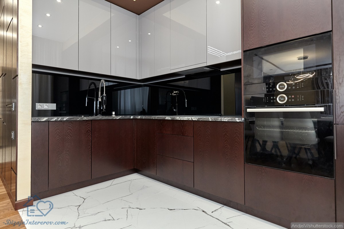 В оформлении ультрамодного интерьера кухни в классическом стиле остается популярным цвет, близкий к натуральному шоколаду. Чисто психологически оттенки коричневого положительно влияют на людей, подчеркивают стабильность и уют в семье. Хорошо сочетается с нейтральными цветами и эффектными элементами декора.
