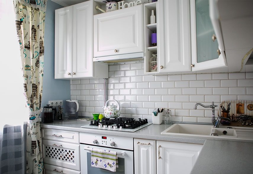 - Прованс. Этот стиль самый «домашний», уютный, теплый. Здесь уместны цветочные принты, резьба, плетеные корзины, кружева, живые цветы. Цвет фасада кухни в стиле прованс может быть оливковым, зеленым, синим, голубым (любые пастельные приглушенные оттенки, как будто немного выцветшие).