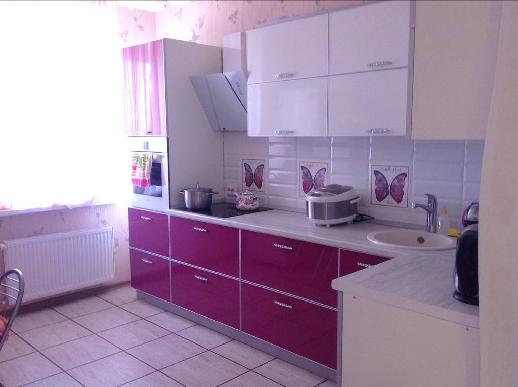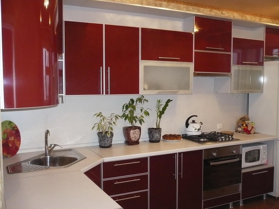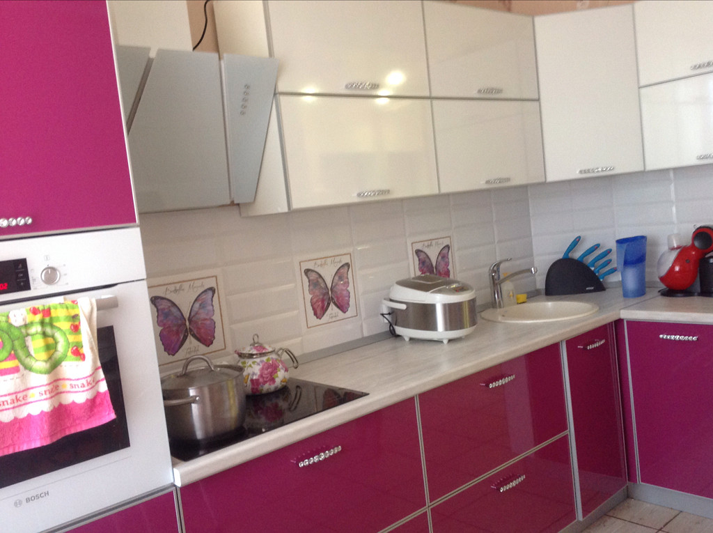 Наиболее выигрышно сочные насыщенные цвета фасадов с загадочным блеском смотрятся в белых кухонных помещениях, но такой вариант не подходит большим семействам, где предполагается постоянное нахождение хозяйки у плиты.
