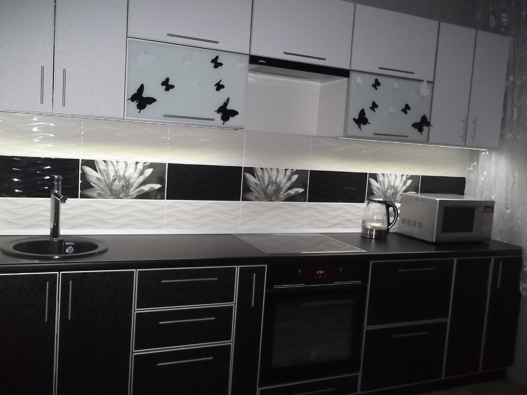 Интерьерная сплошная фотопечать может быть выполнена на одном или нескольких дверцах изделия, или же общей картинкой на всех дверцах верхнего, или даже обоих ярусов мебельного гарнитура.