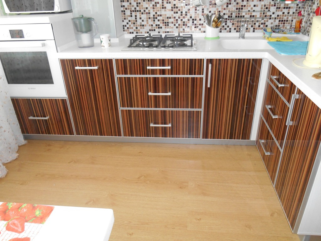 МДФ покрытый такой плёнкой смотрится не очень дорого. Но зато, мыть его можно как угодно и сколько угодно. Абразивов он не боится. Зато, он боится ударов и от этого могут случиться сколы, которые потом ничем не уберёшь.