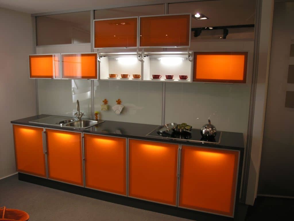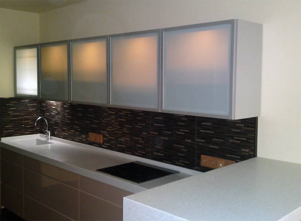 Основой может служить пластик и стекло. Такой материал в алюминиевой рамке выбирают чаще всего для кухонь в стиле техно. Использоваться может тонированное, прозрачное, а также стекло с пескоструйной обработкой, глянцевый пластик или крашеный МДФ. Еще одна особенность такого будет состоять в том, что своими руками можно изготовить все шкафчики – для этого понадобится алюминиевый профиль и подготовленный лист МДФ или ДСП.