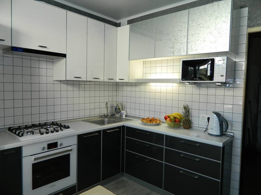 На кухнях в стиле хай-тек хорошо смотрятся комбинированный вариант. Например, черный низ и белый верх.