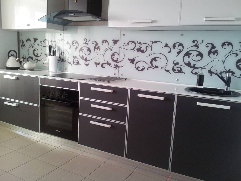 Не менее оригинально будут выглядеть гарнитуры с фасадами, на стекла которых нанесена узорная фотопечать на прозрачном фоне с последующим перекрытием этого фона эмалью. Узорные бесшовные рисунки печатаются в любом нужном Вам цвете и перекрываются любым контрастным декором эмали, который можно выбрать из нашей складской программы, систем RAL, NCS, или любого другого международного цветового стандарта.