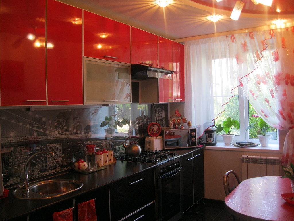 Если грамотно подобрать цветовую линию, то можно органично вписать акриловые кухни в различные интерьеры. Особенно выигрышно они смотрятся в смелых по дизайну современных стилевых решениях. Блестящие глянцем поверхности придутся по душе, если кухня тяготеет по доминирующим чертам к стилю хай-тек.