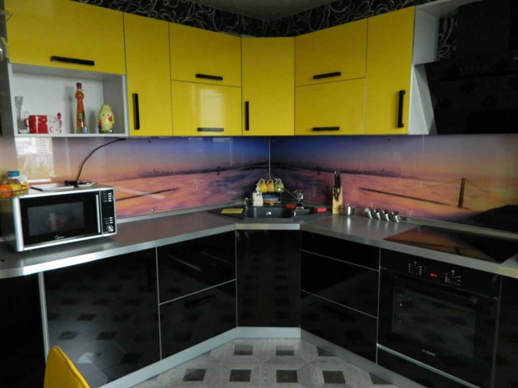 Неплохо смотрятся одноцветные гарнитуры с контрастным или принтованным фартуком.