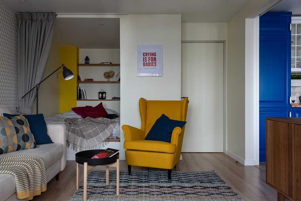 В концепции интерьера прослеживается тема геометрии. Это керамическая плитка, обои и поддерживающий их кухонный фартук. На полу в кухне, на лоджии и в ванной использовали плитку шеврон. Пространство как бы объединено отделкой. Дополняет оформление яркая мебель в синих и желтых тонах.