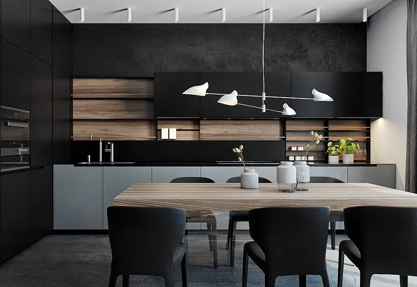 Данное направление подходит для кухонь с разной площадью. При этом основной задачей дизайнеров является обеспечение лаконичности, функциональности, комфорта и свободного пространства.