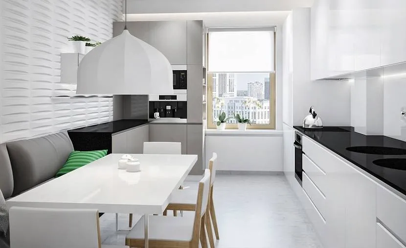 В такую кухню идеально впишется простой стол из закаленного стекла, который не будет загромождать пространство, или барная стойка, выходящая из части подоконника. Стулья так же желательно выбирать пластиковые, без текстильных вставок и гобелена. В крайнем случае подойдут стулья с кожаными натяжными сидушками.
