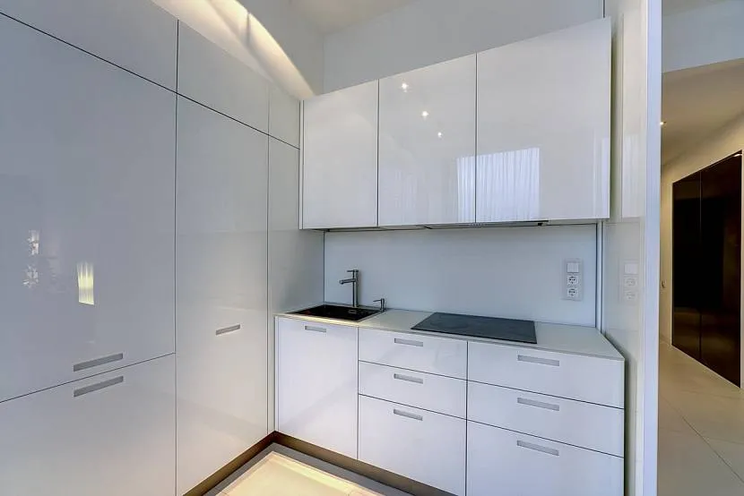 Кухонный гарнитур призван поддерживать безупречный порядок, он должен быть подобран таким образом, чтобы вся кухонная утварь была скрыта от посторонних глаз. Если предполагается встроенная мебель, стены и шкафы должны сливаться в единой плоскости. То же самое можно сказать и об угловых вариантах. За глянцевыми фасадами должна быть спрятана вся бытовая техника. Ручки в таких шкафчиках преимущественно скрытые, а дверцы открываются при нажатии.