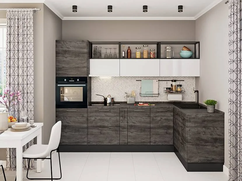 Такой выбор является подходящим как для больших и просторных кухонь, так и для комнат небольшого размера, предполагающих максимально сжатое расположение предметов. Неплохо будет смотреться гарнитур без верхних шкафчиков. В такой кухне будет гораздо уютнее. Цвет гарнитура можно будет подобрать в тон стеновому покрытию, либо выделить его при помощи других, более контрастных оттенков.