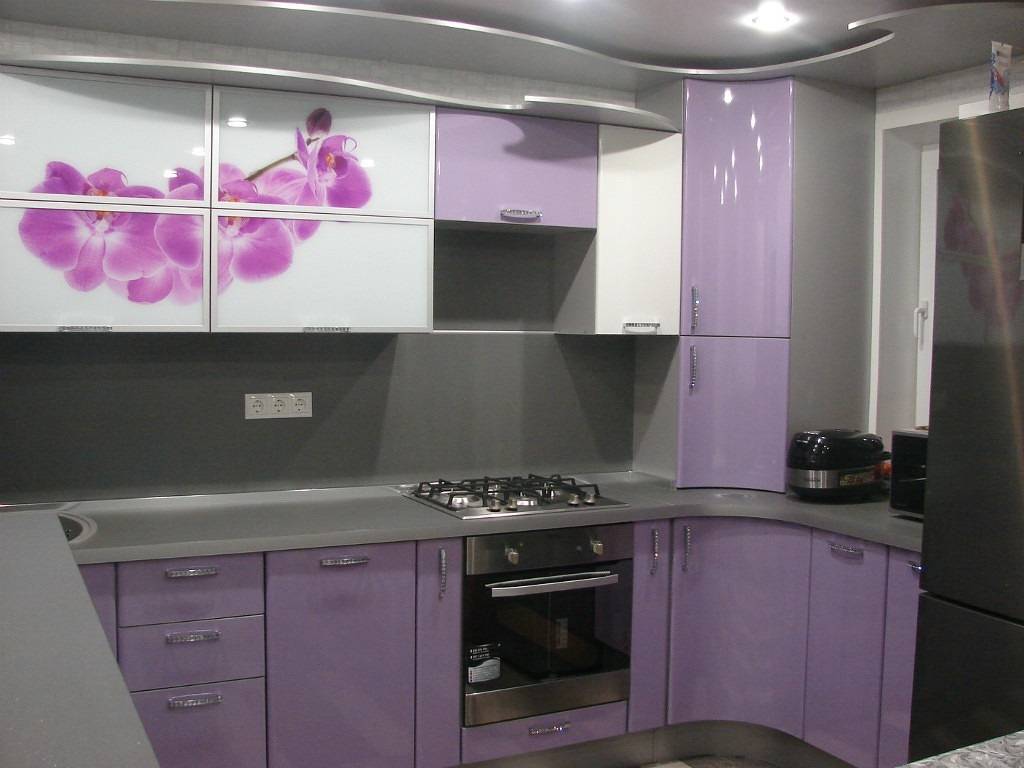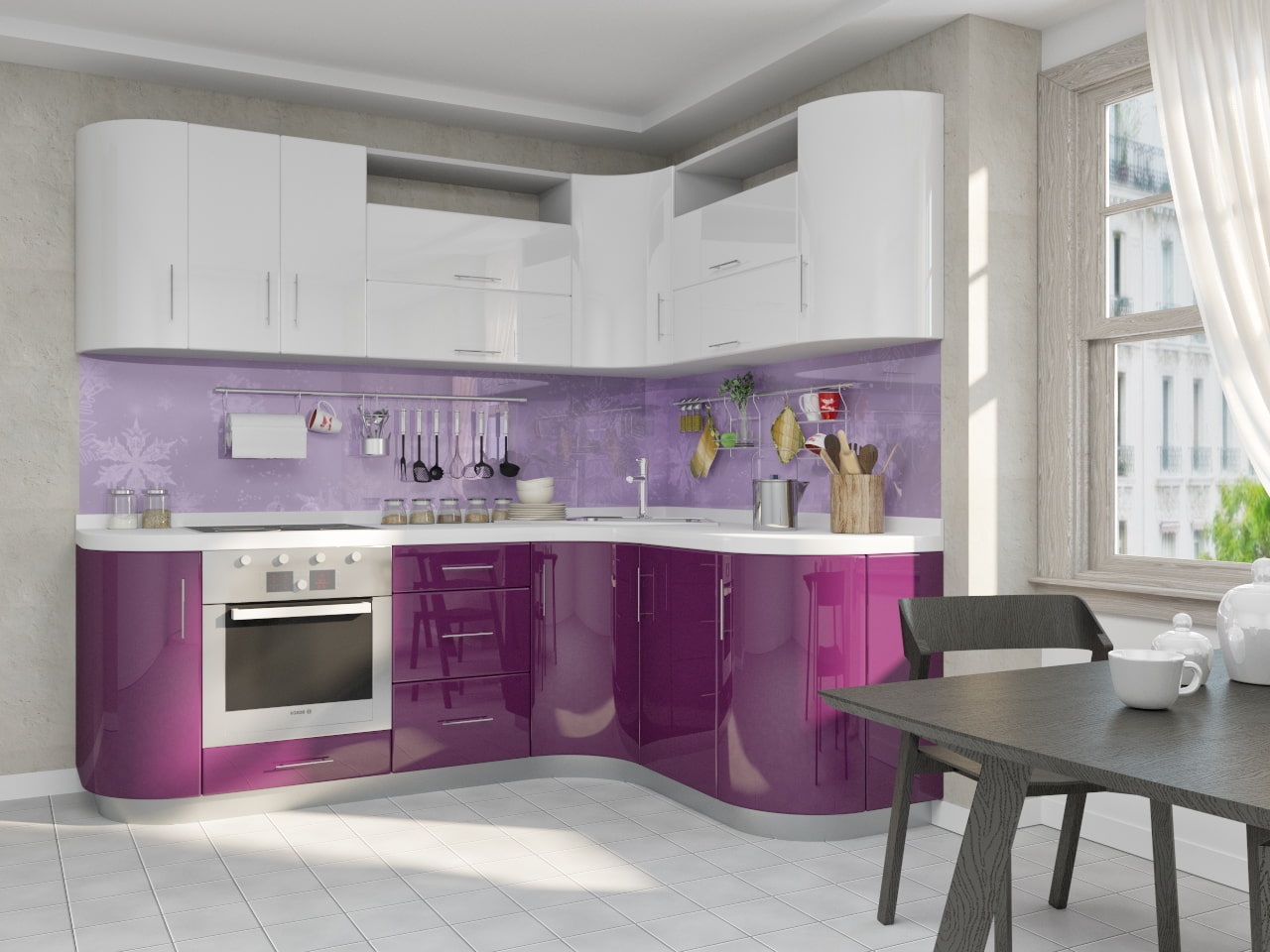 Строгие прямоугольные формы шкафов, глухие однотонные фасады, лаконичная фурнитура — вот основные характеристики гарнитура стиля модерн. Именно на ровных гладких фасадах кухонной стенки сиреневый цвет сможет проявиться, продемонстрировать свою привлекательность и выразительность. Сиреневая мебель станет ярким акцентом на фоне стен белого, бежевого или серого цвета. Фото дизайна строгой угловой кухни сиреневого цвета можно увидеть ниже.