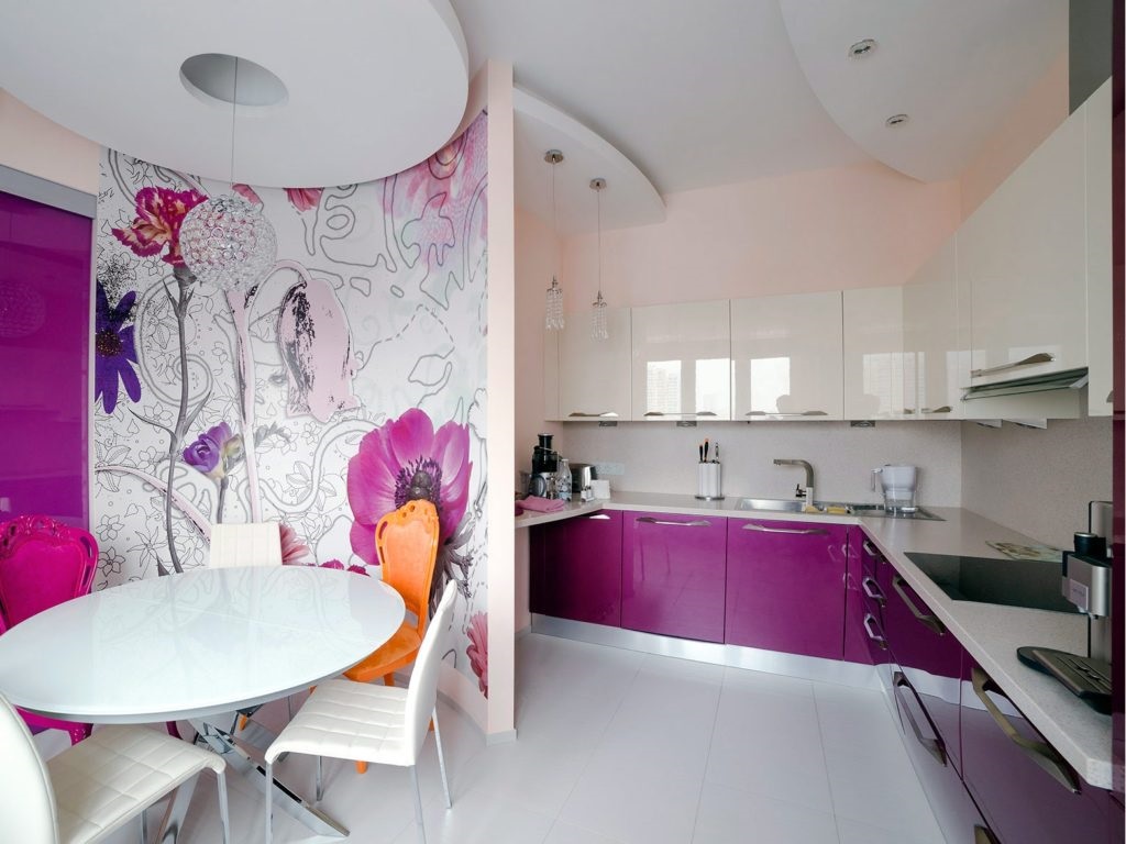 В этом стиле будет хорошо смотреться сиреневый цвет любой насыщенности. Им можно выделить любую часть интерьера: стены, потолок, пол, мебель, декор. Лиловый можно сочетать с любым другим ярким цветом, например, лаймовым, ярко-розовым, алым. Главное правило — обязательное присутствие белого. В противном случае атмосфера в кухне получится агрессивной. Дизайн интерьера лиловой кухни можно увидеть на фото.