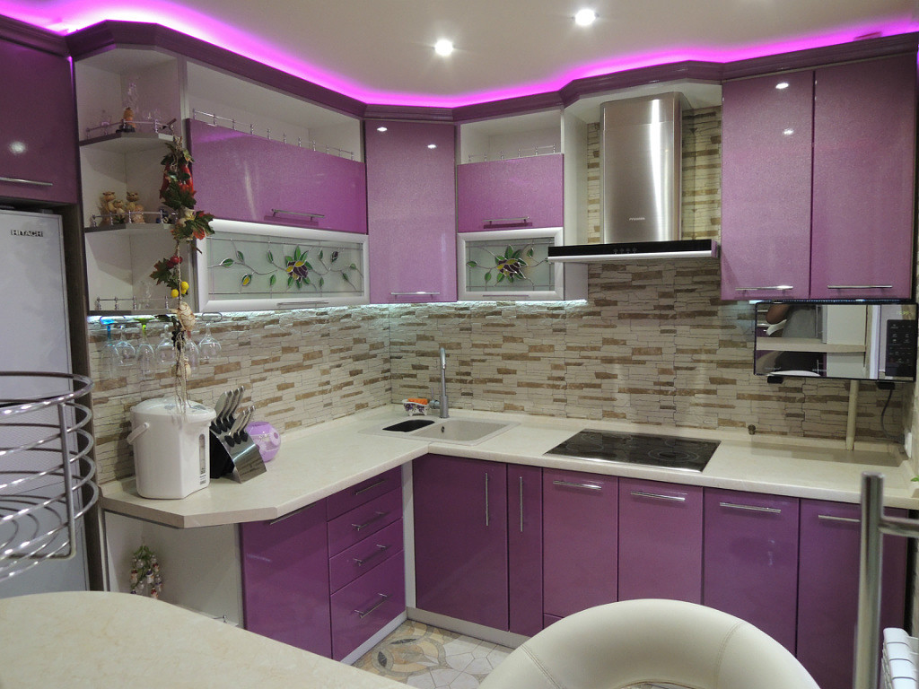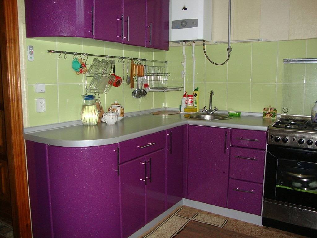 Возможно ли реализовать все это в небольшом помещении 4-10 квадратов? А почему бы и нет! Главное, учитывать несколько рекомендаций. Подробнее о них написано в отдельной статье. Тут же просто приведем несколько удачных дизайнерских решений для маленьких фиолетовых кухонь.