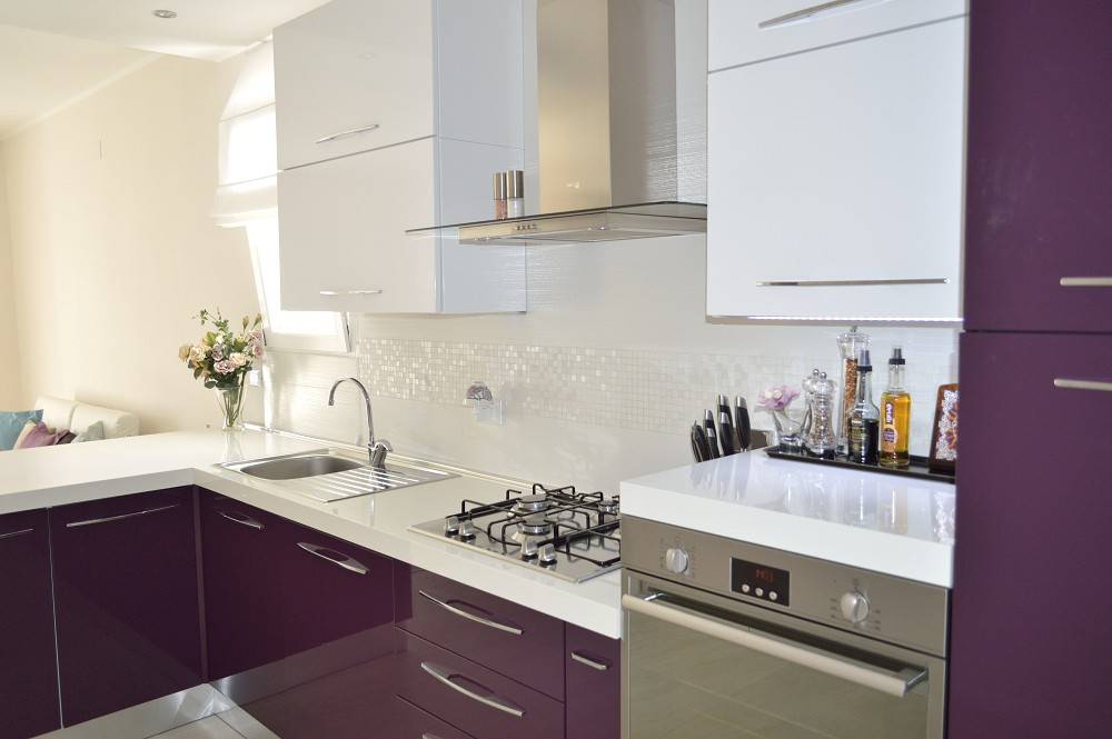 Окрасить в фиолетовый можно только нижние шкафы, остальную часть кухни сделать белой.