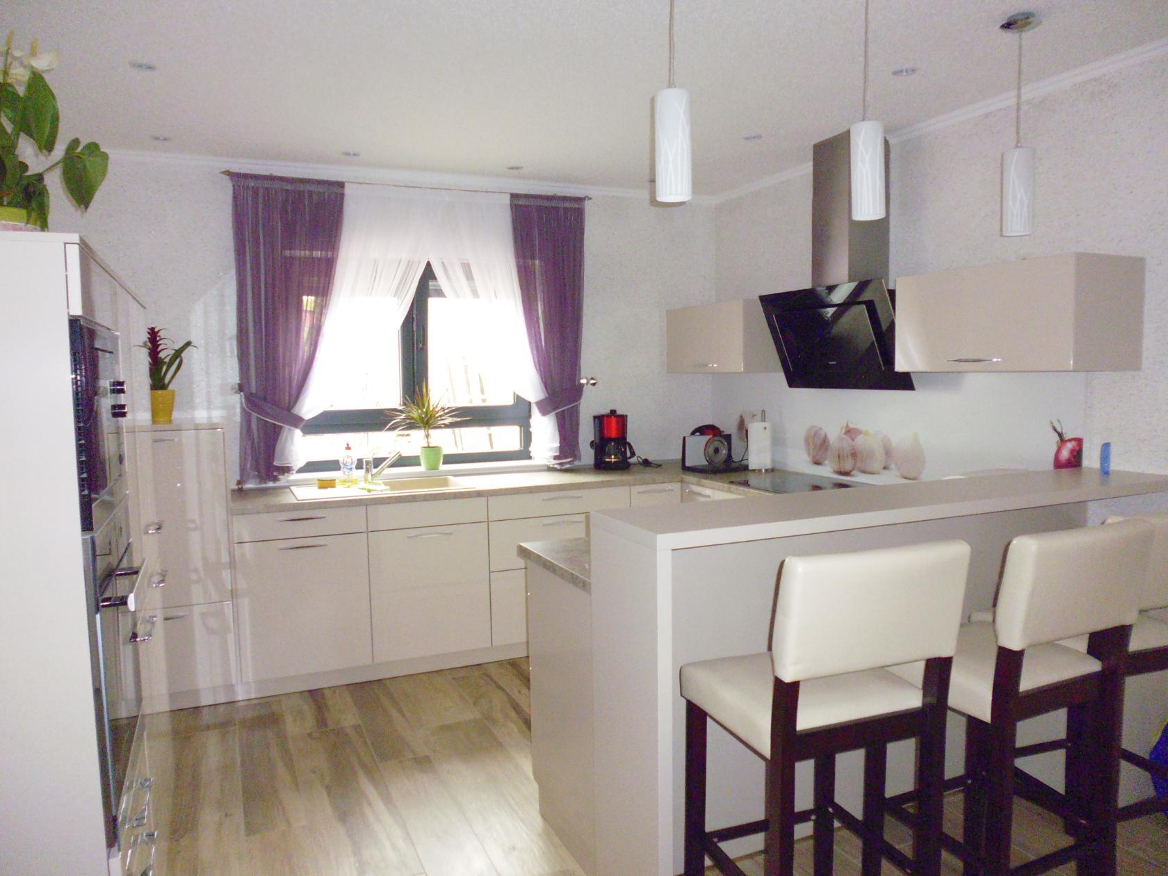 В белом цвете можно обустроить столешницы в рабочей зоне, обеденный стол (идеально подойдет круглая модель), стулья вокруг него, обои и фартук. Очень красиво в данном интерьере будет смотреться деревянный гарнитур (подойдут и такие материалы, как МДФ, ДСП), выполненный в нежно-сиреневом цвете.