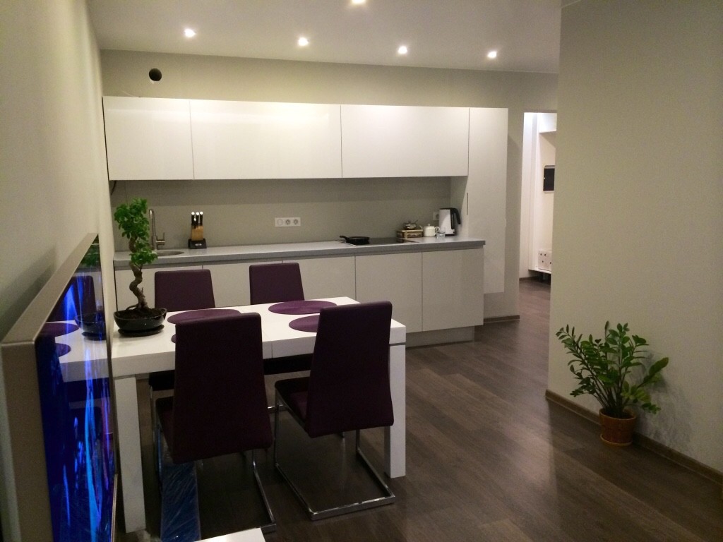 Для дизайна кухни этого современного стиля приемлемы как светлые, так и тёмные насыщенные тона сиреневого. Кухня обязательно должна быть оснащена большим количеством светильников, чтобы демонстрировать свои достоинства не только при естественном освещении. Блестящие глянцевые фасады с глухими дверками будут прекрасно смотреться в фиолетовом цвете. Картину современного интерьера дополнят хромированные элементы, стеклянные поверхности и обилие встроенной современной техники. Фото маленькой прямой кухни сиреневого цвета в стиле хай-тек можно увидеть ниже.