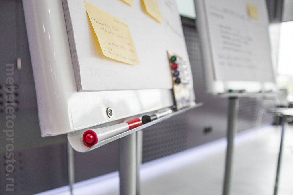 Также важно обратить внимание на конструкцию: наличие колес для легкого перемещения, размеры и материалы доски для записей.