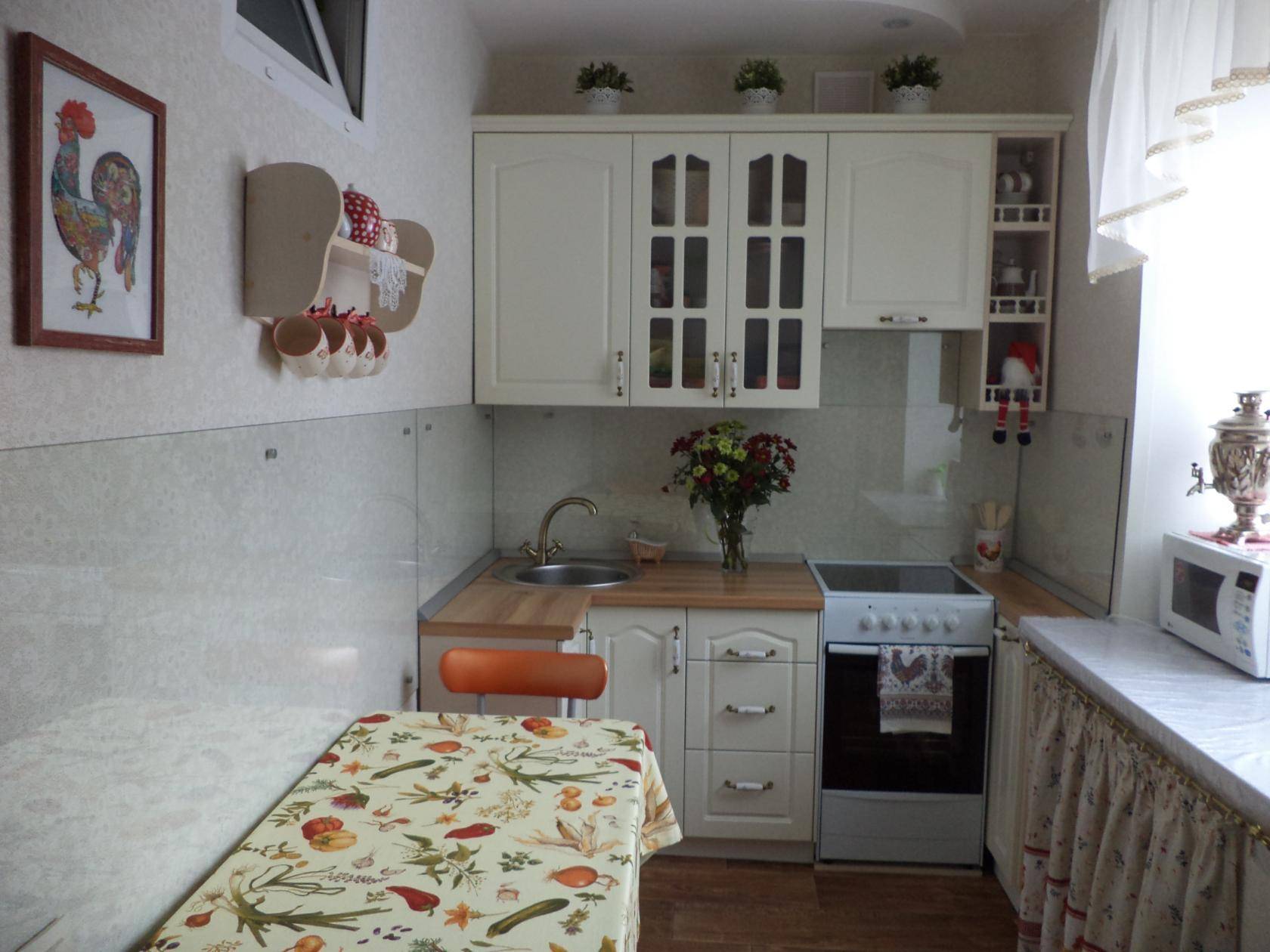 Гарнитур в помещении площадью 7 кв. м правильно спроектирован и скомпонован. Возможный минус: холодильник будет загораживать свет от окна в дневное время. Используйте для оформления проема легкие ткани, чтобы в комнату проникало больше света.