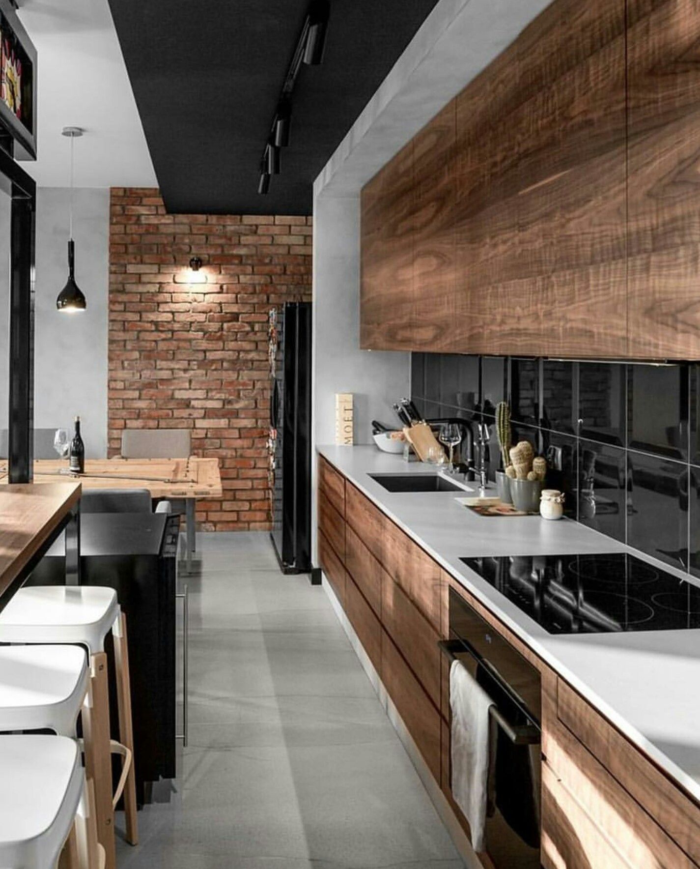 Установка барной стойки — оптимальный выбор для узкой кухни, где для обеденного стола не остается места. В такой ситуации небольшую барную стойку оборудуют у стены с окном, для удобства можно сделать ее откидной.